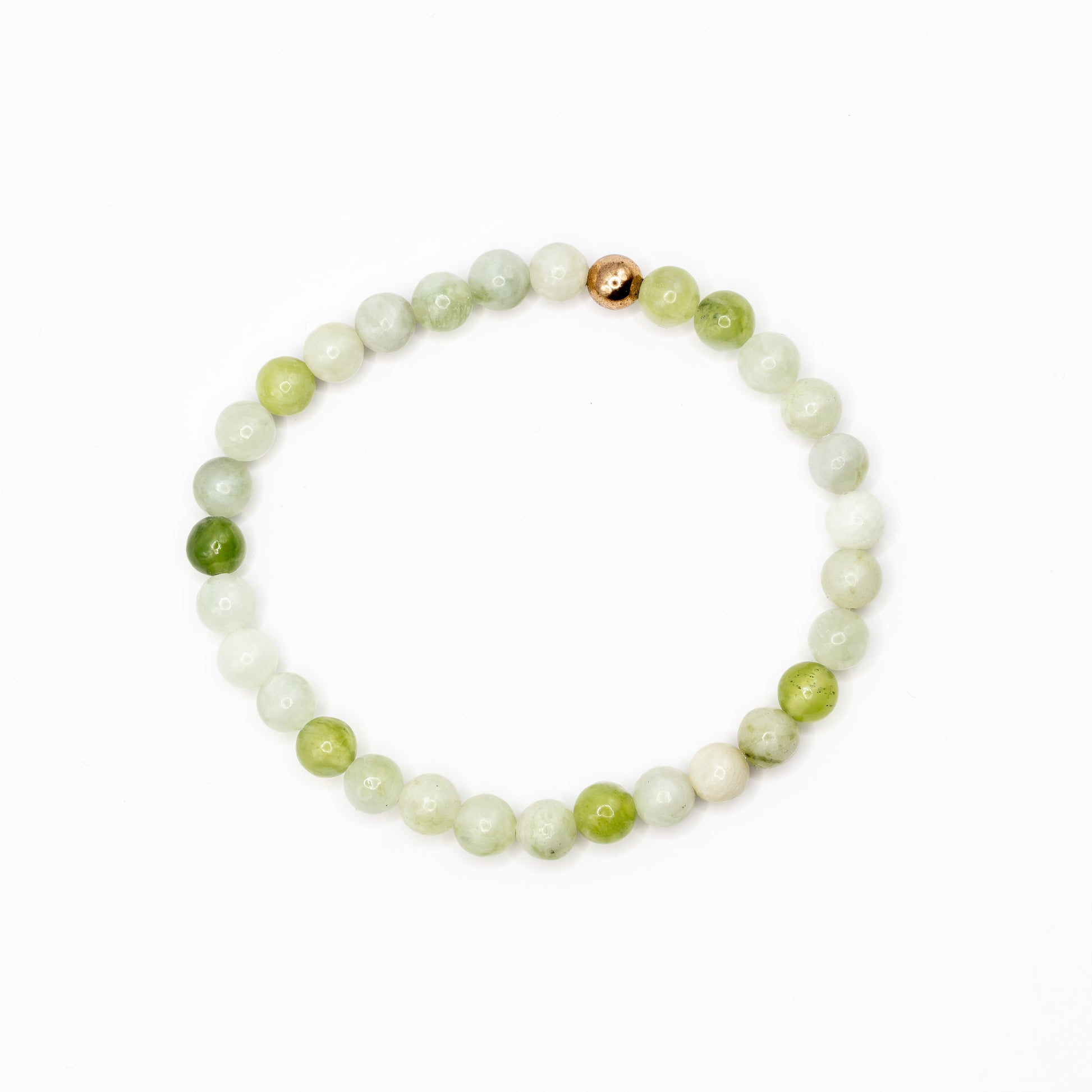 Dette håndlagde armbåndet er laget med 6 mm kalsedoner, og har en perle i bronse for et elegant preg. Den elastiske tråden gjør armbåndet enkelt å ta av og på, noe som gjør det både praktisk og stilfullt. Begrenset opplag.