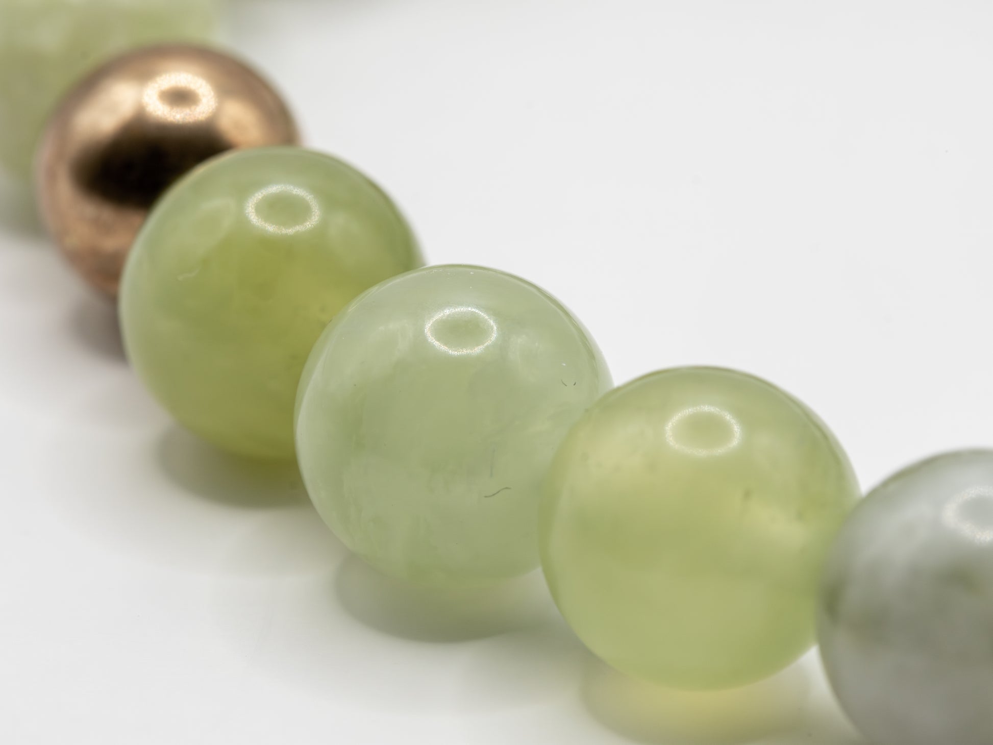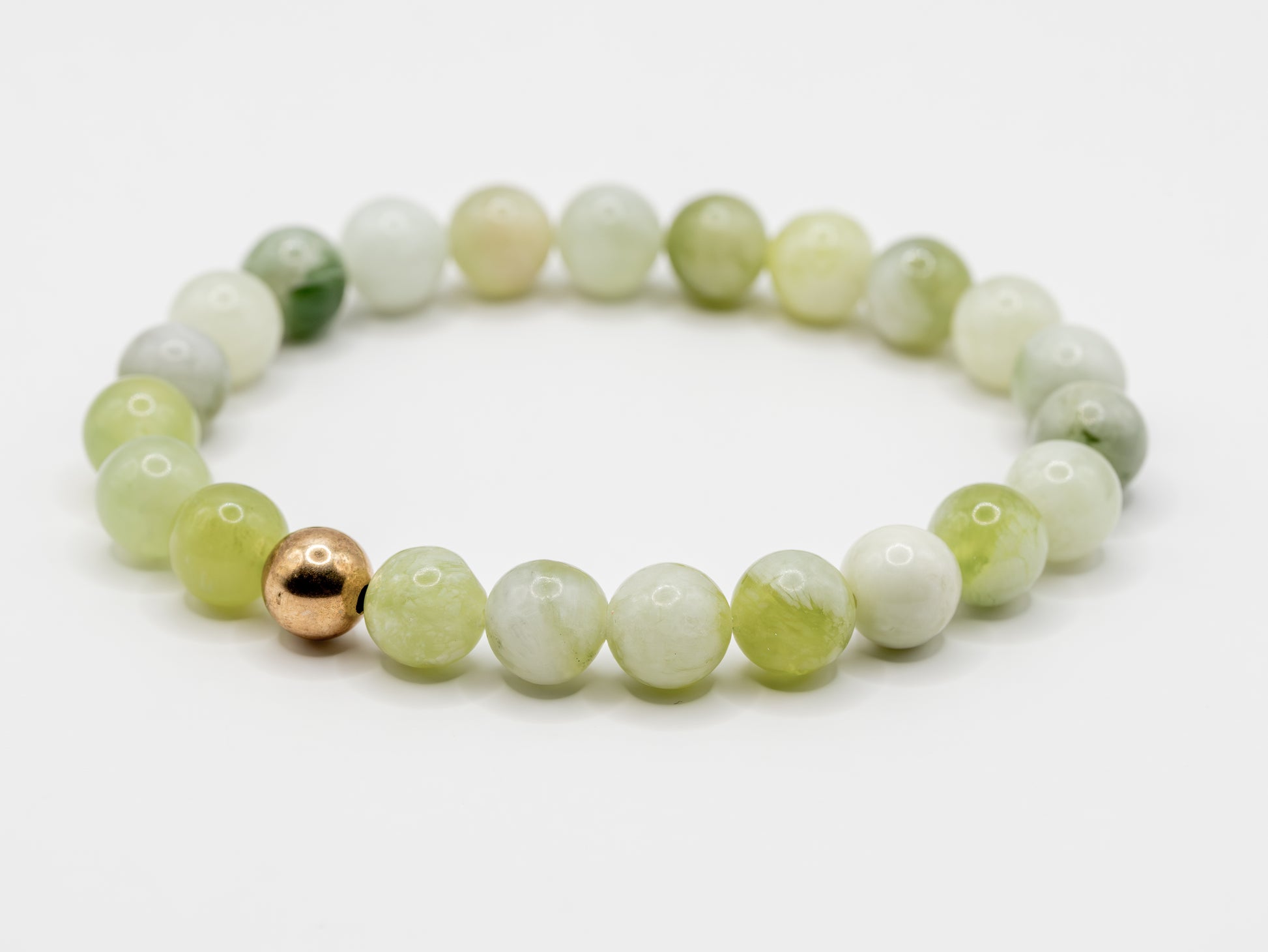 Dette håndlagde armbåndet er laget med 8 mm kalsedoner, og har en perle i bronse for et elegant preg. Den elastiske tråden gjør armbåndet enkelt å ta av og på, noe som gjør det både praktisk og stilfullt. Begrenset opplag.